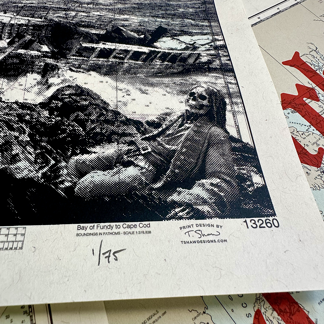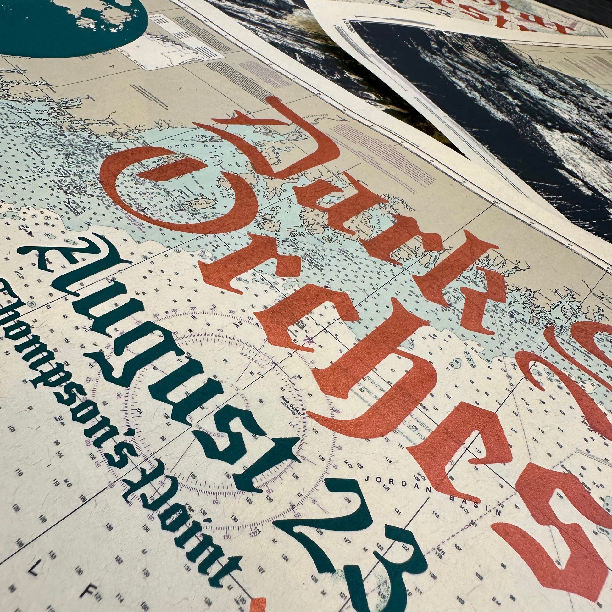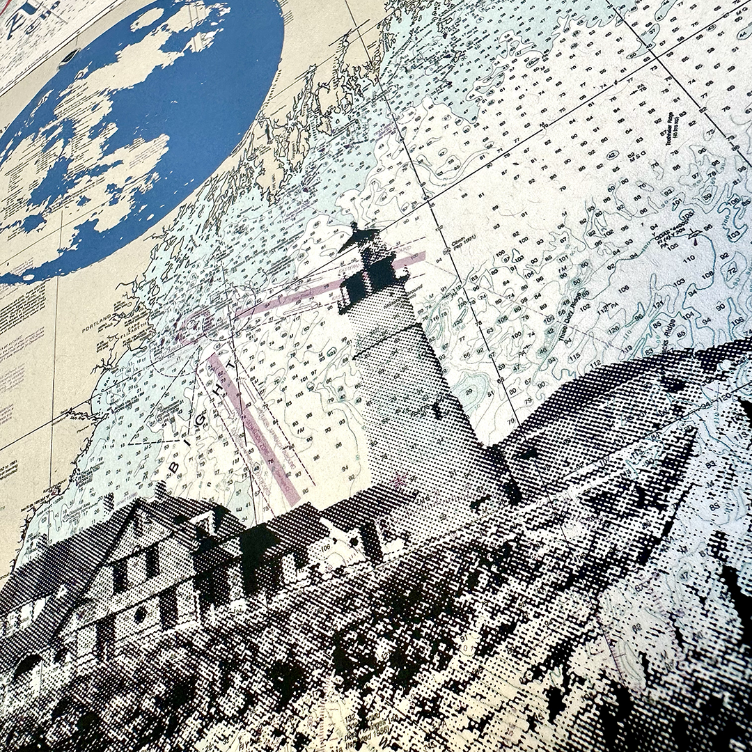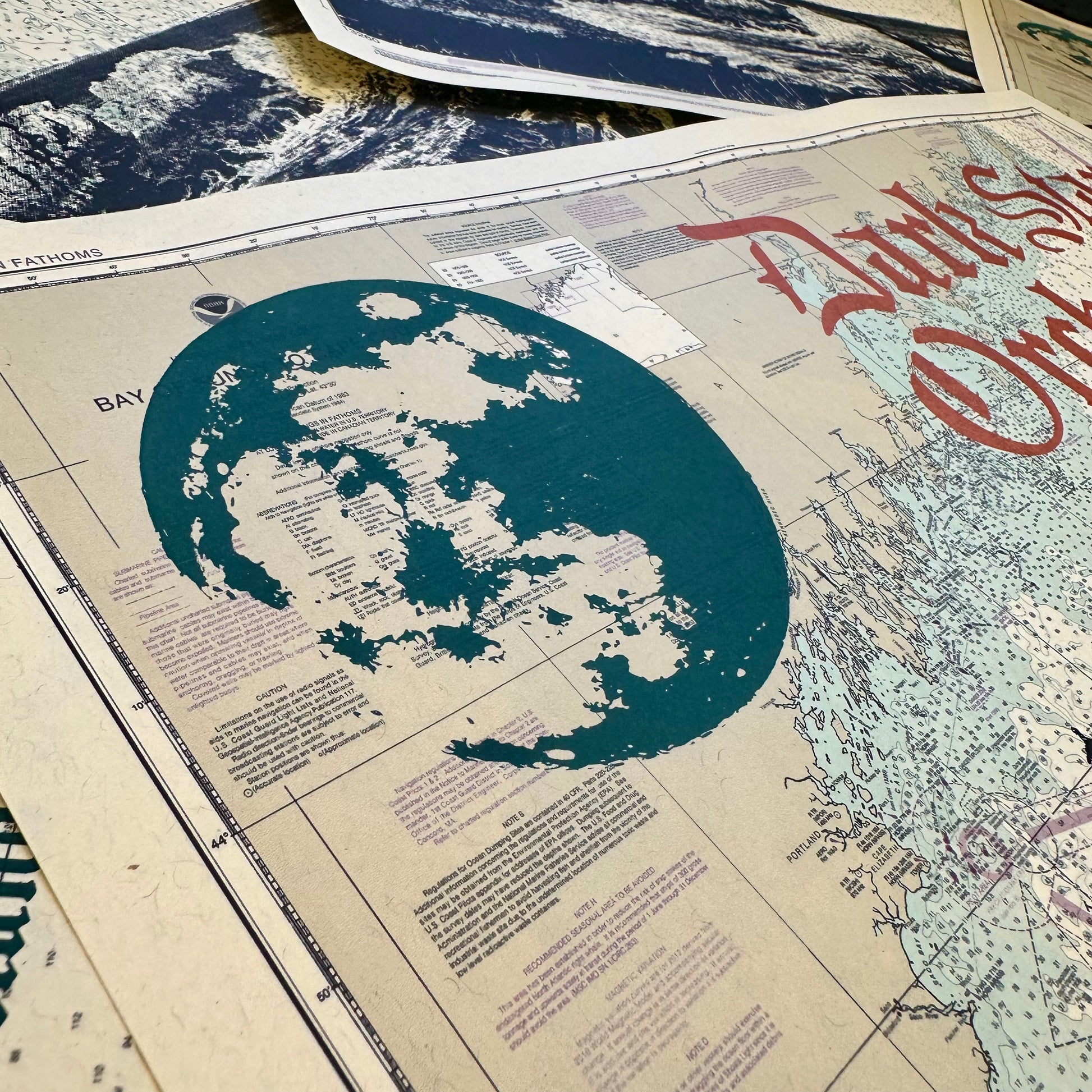 3 color hand-pulled silkscreen, printed directly on top of an authentic NOAA chart of Portland's local waters