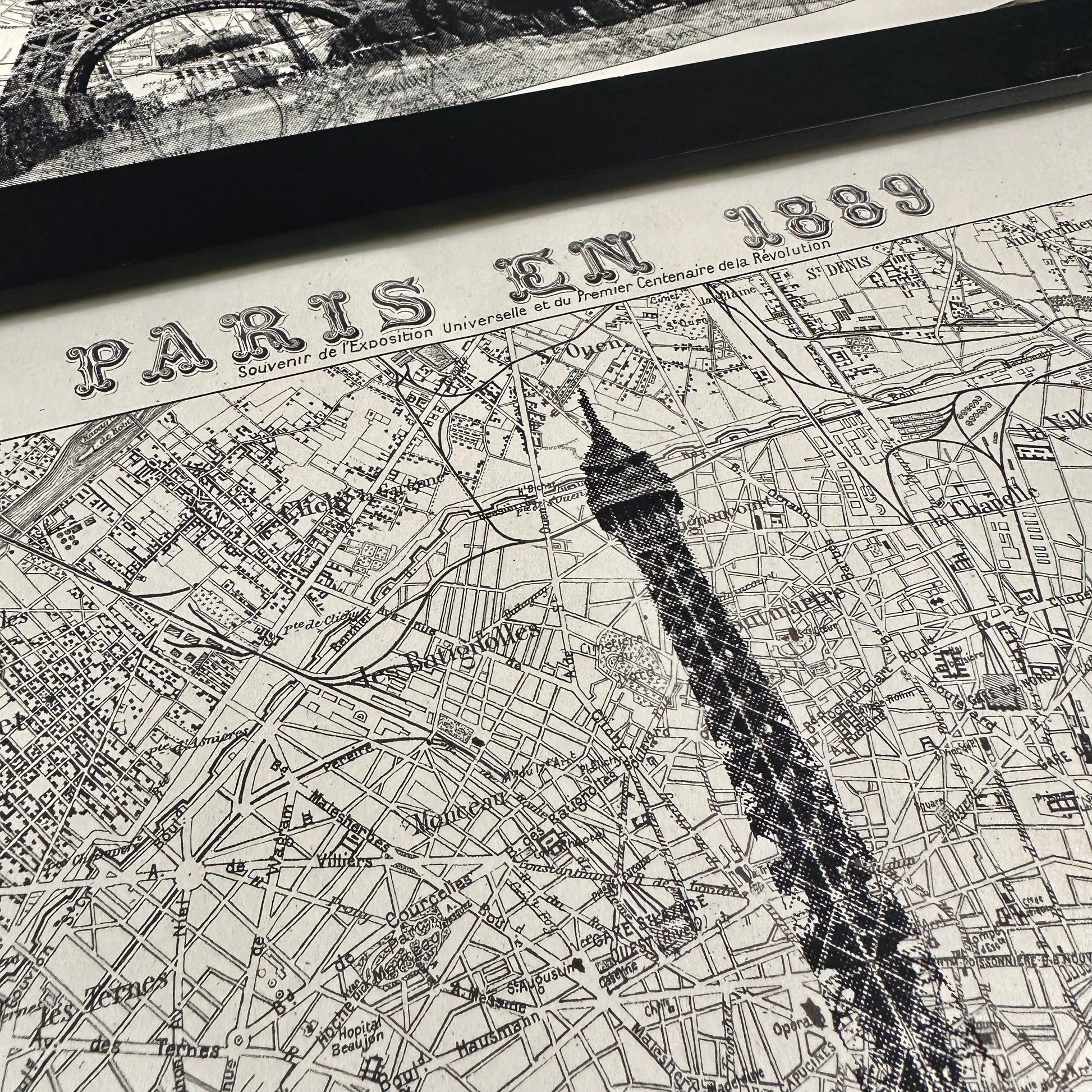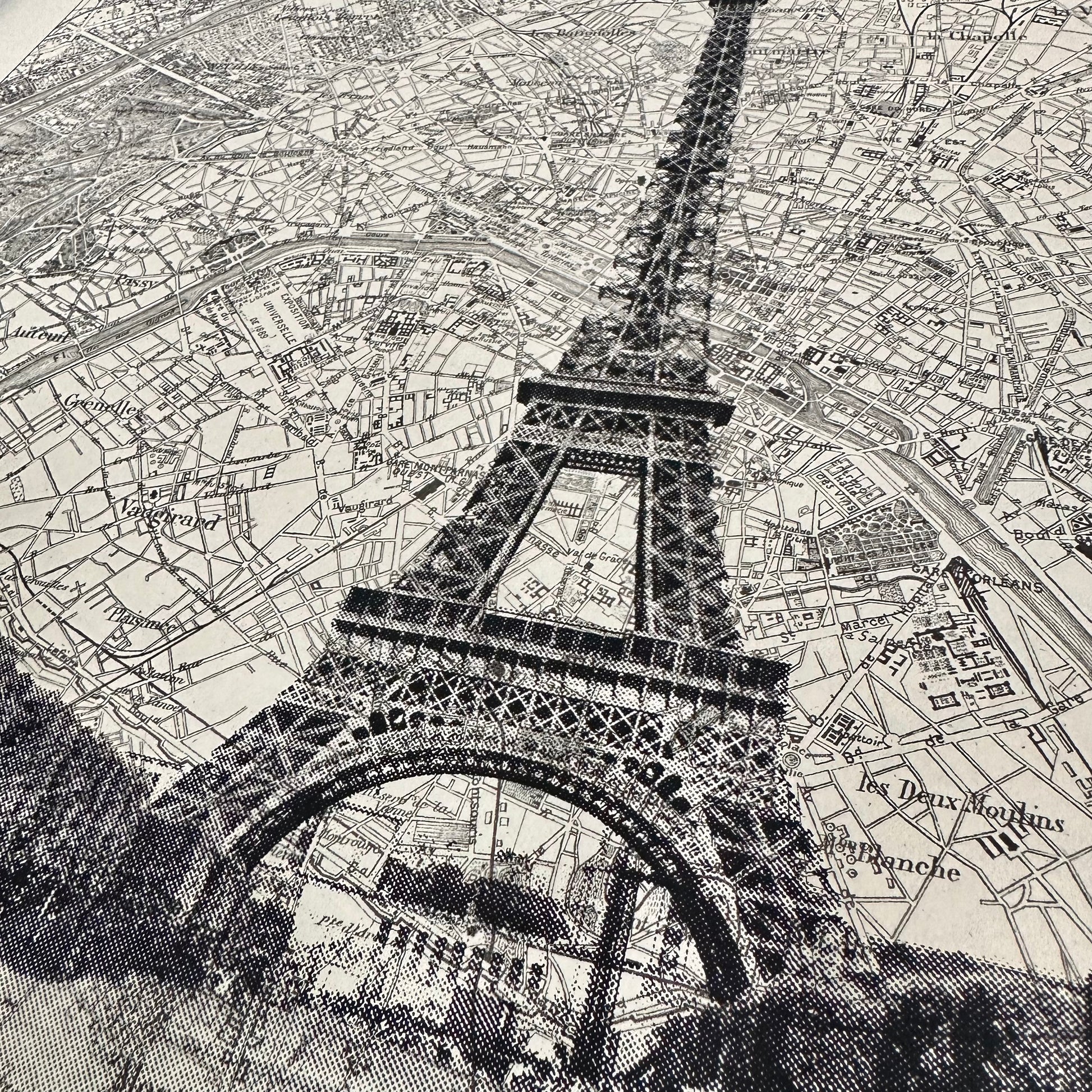 Silkscreen on circa 1889 French map of Paris (the year the Eiffel Tower was completed)
