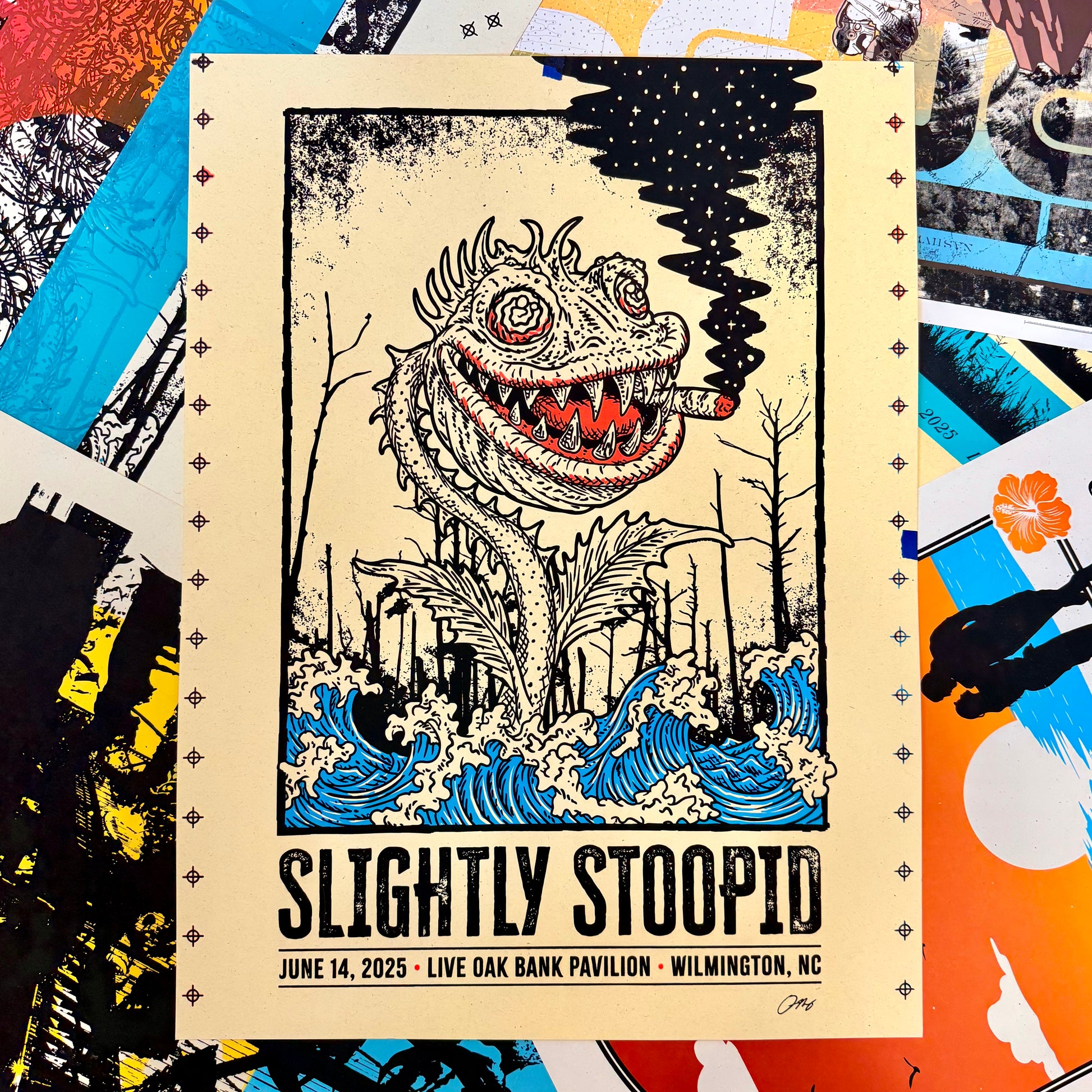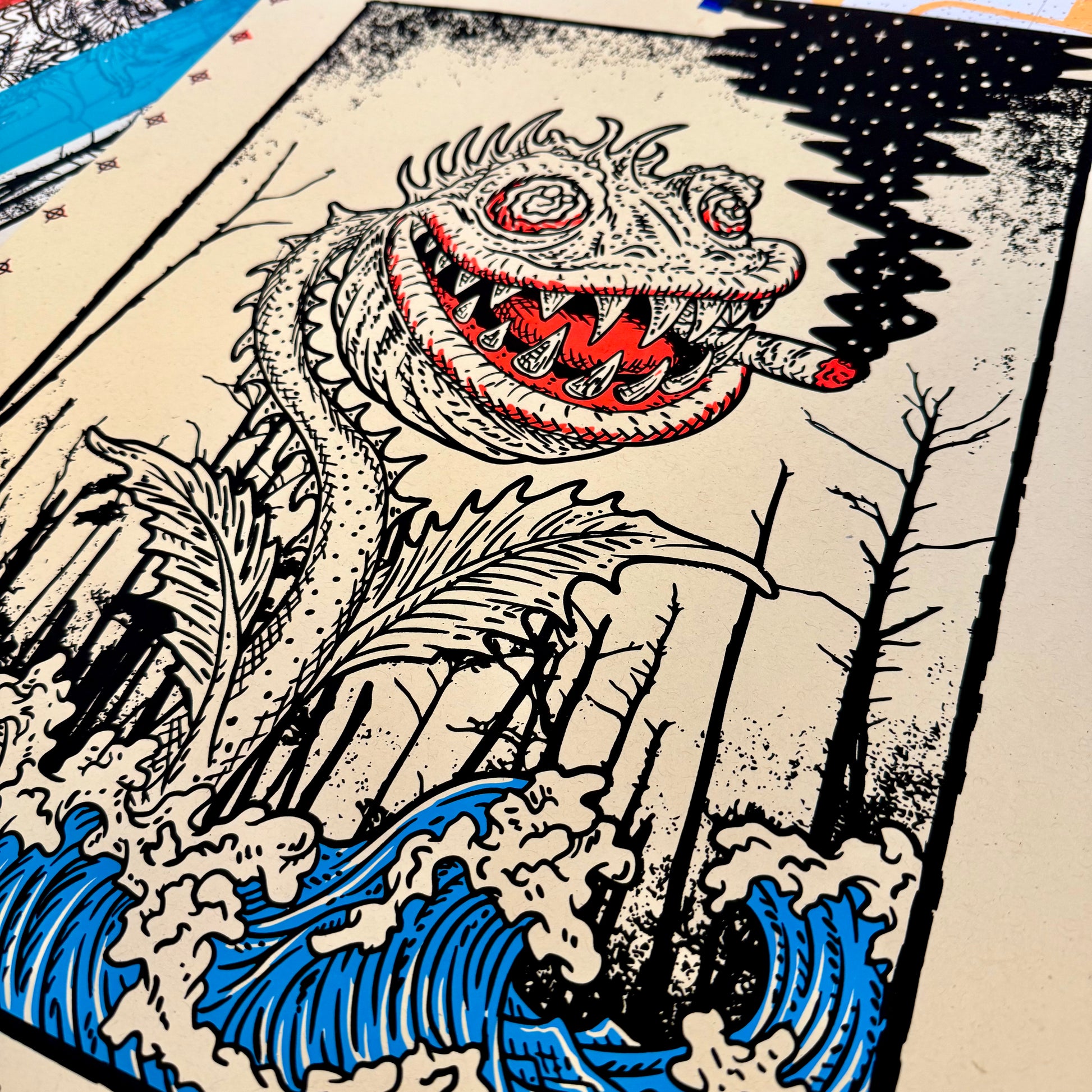 A test print is made while dialing in color, ink opacity, pressure, and registration before an edition is finalized. As layers are adjusted and colors shift, unexpected variations happen. Most test prints get set aside, but the strongest and most interesting ones become monoprints. Each piece is unique and signed 1/1 or 1/1 TEST.