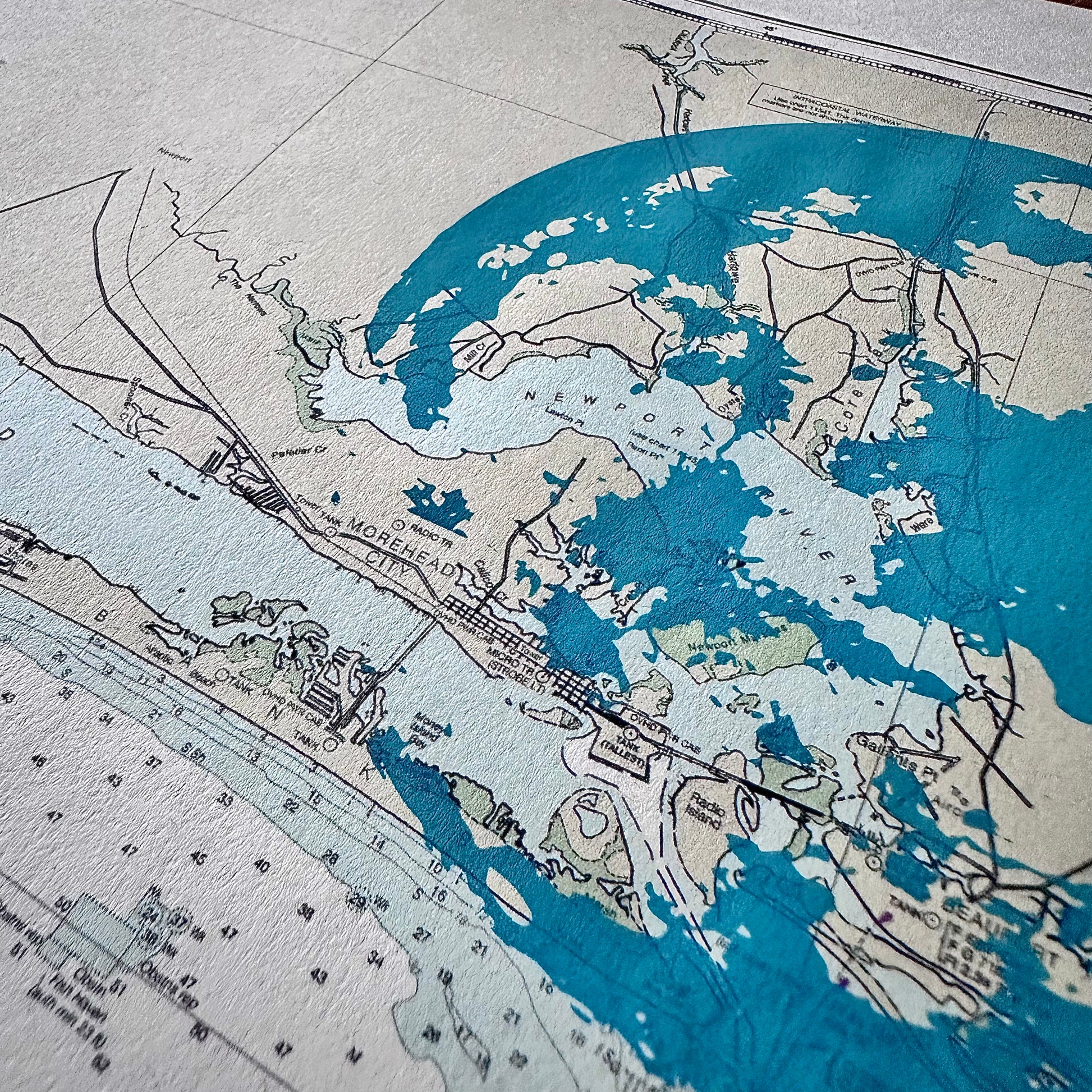 2 color hand-pulled screen print on authentic NOAA chart of the Crystal Coast of North Carolina