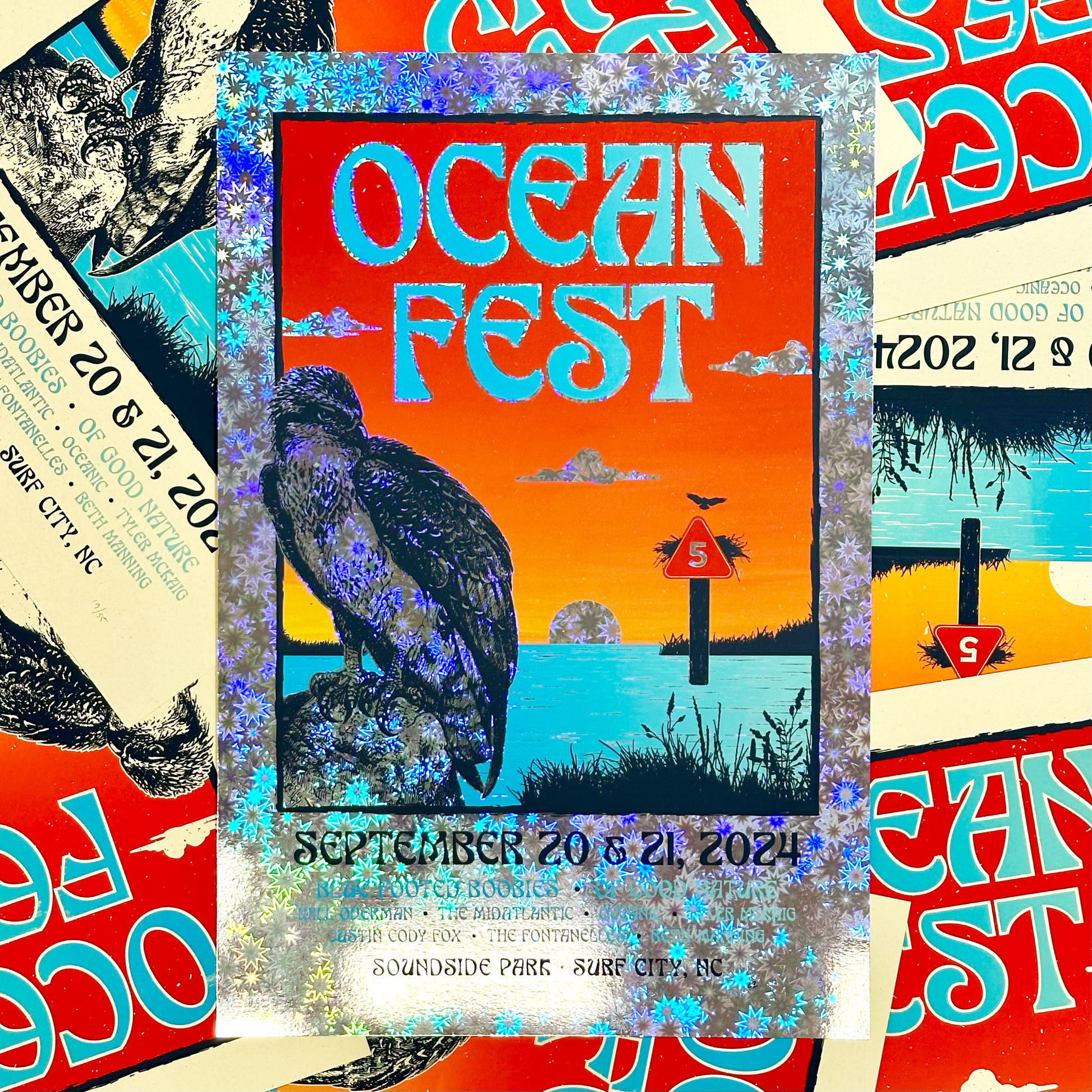 4 color hand-pulled silkscreen with two split fountains; because of the split fountains, each print in the run has its own unique sky, water, and text coloring/markings.