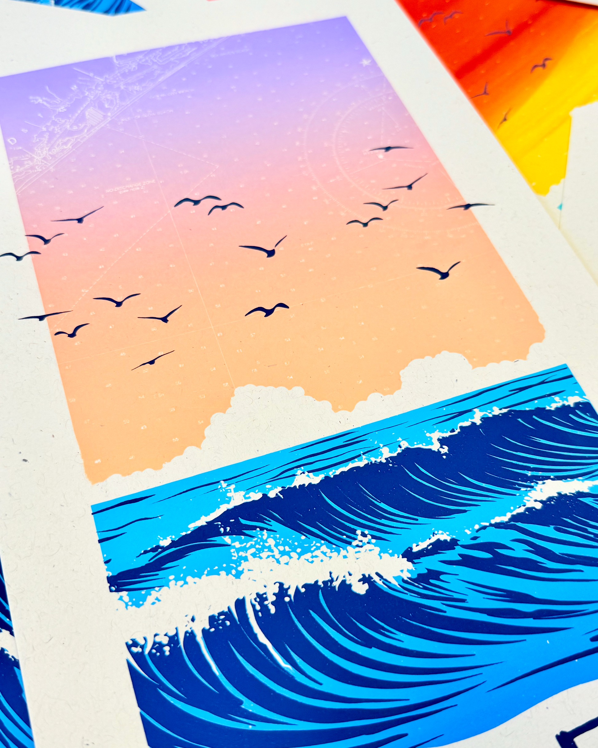 3 color hand-pulled silkscreen with two split fountains; because of the split fountains, each print has its own unique sky and water coloring