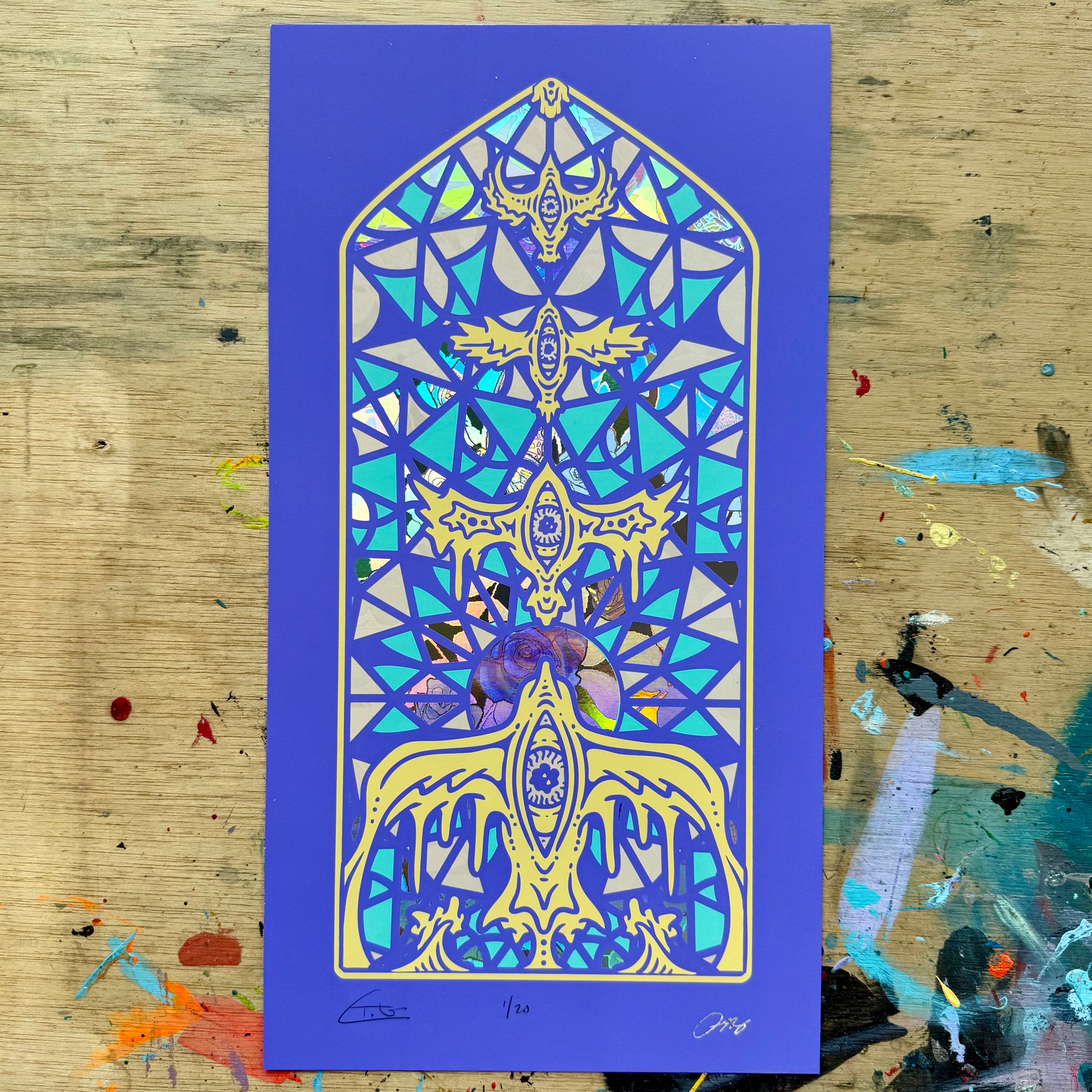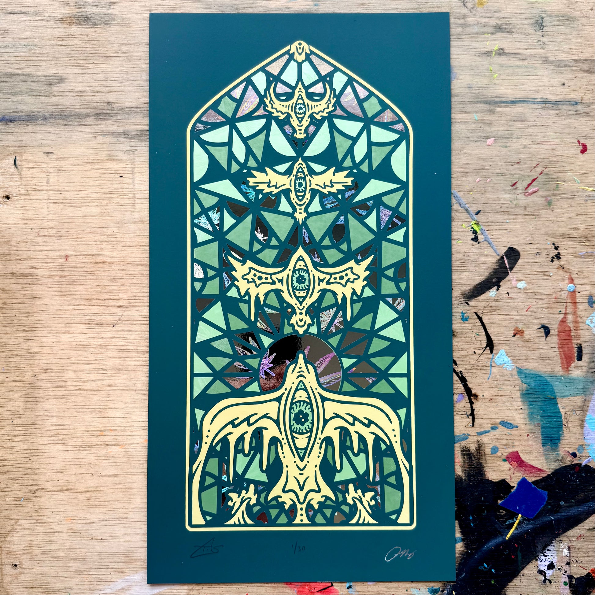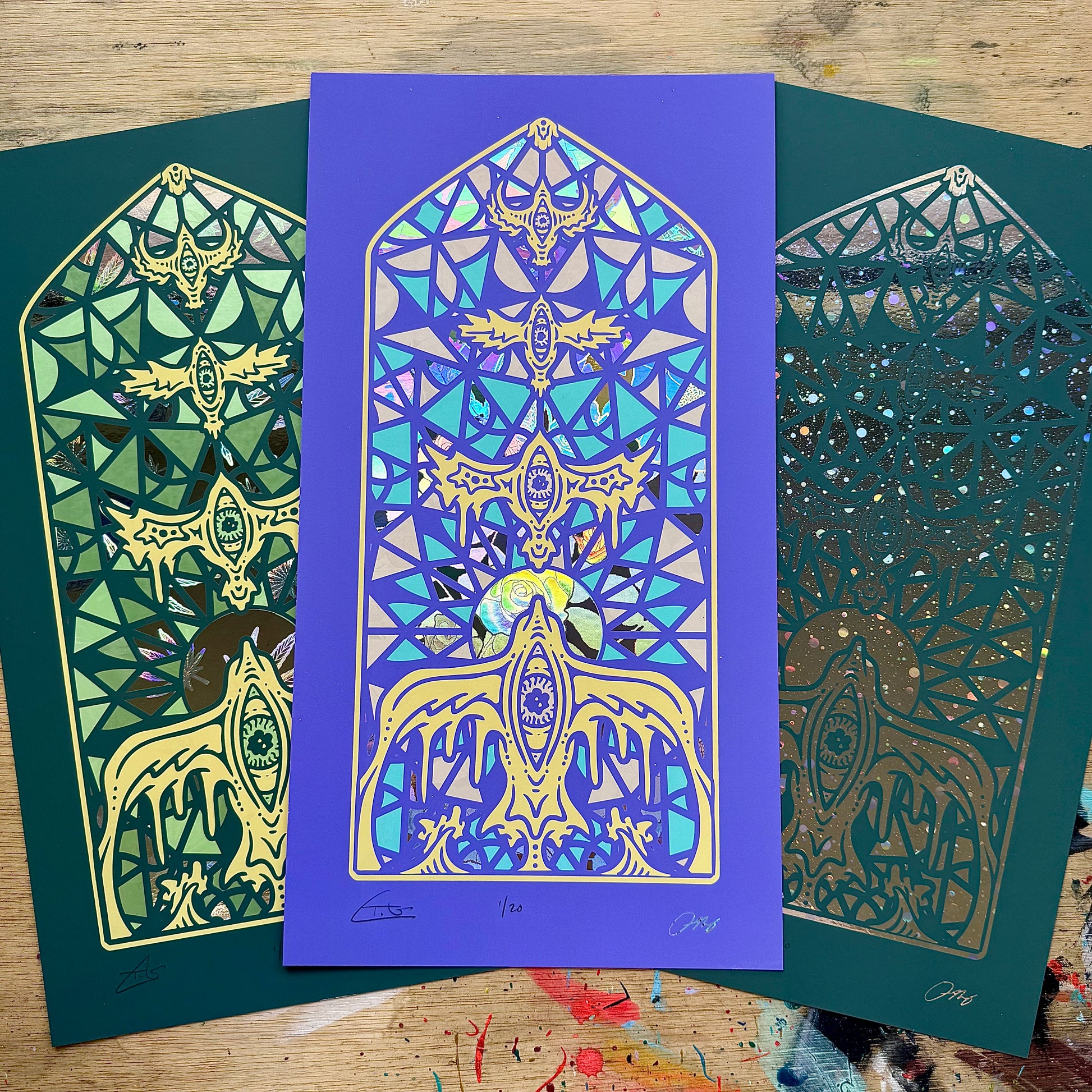 4 color hand-pulled silkscreen, full bleed on holographic foil; foil only shows through in stained glass area (semi-transparent inks)
