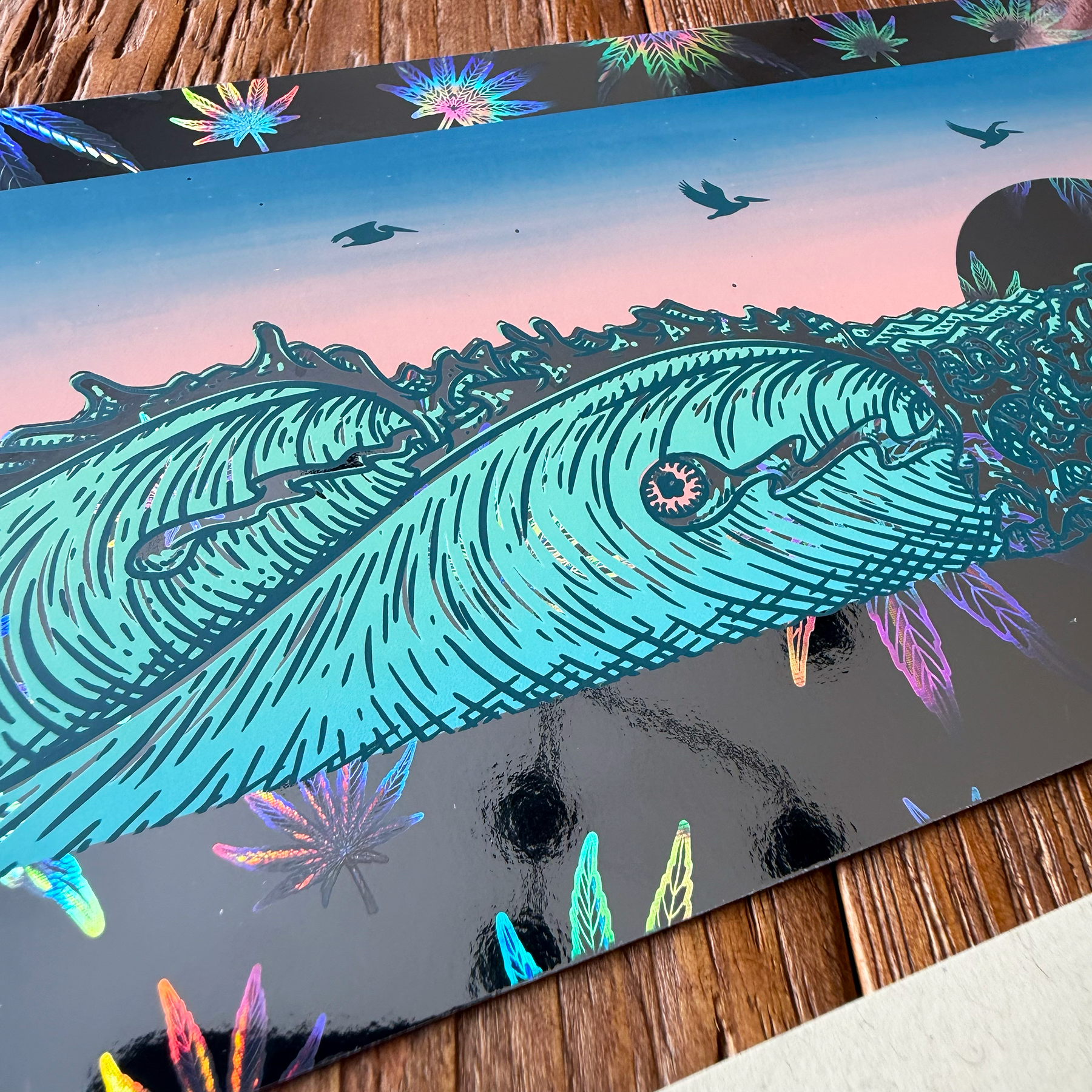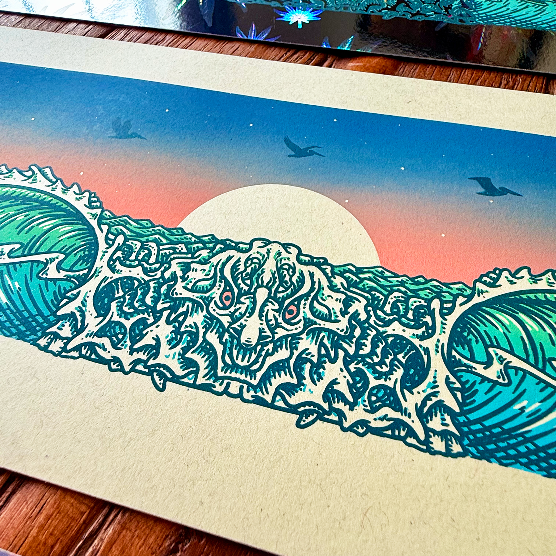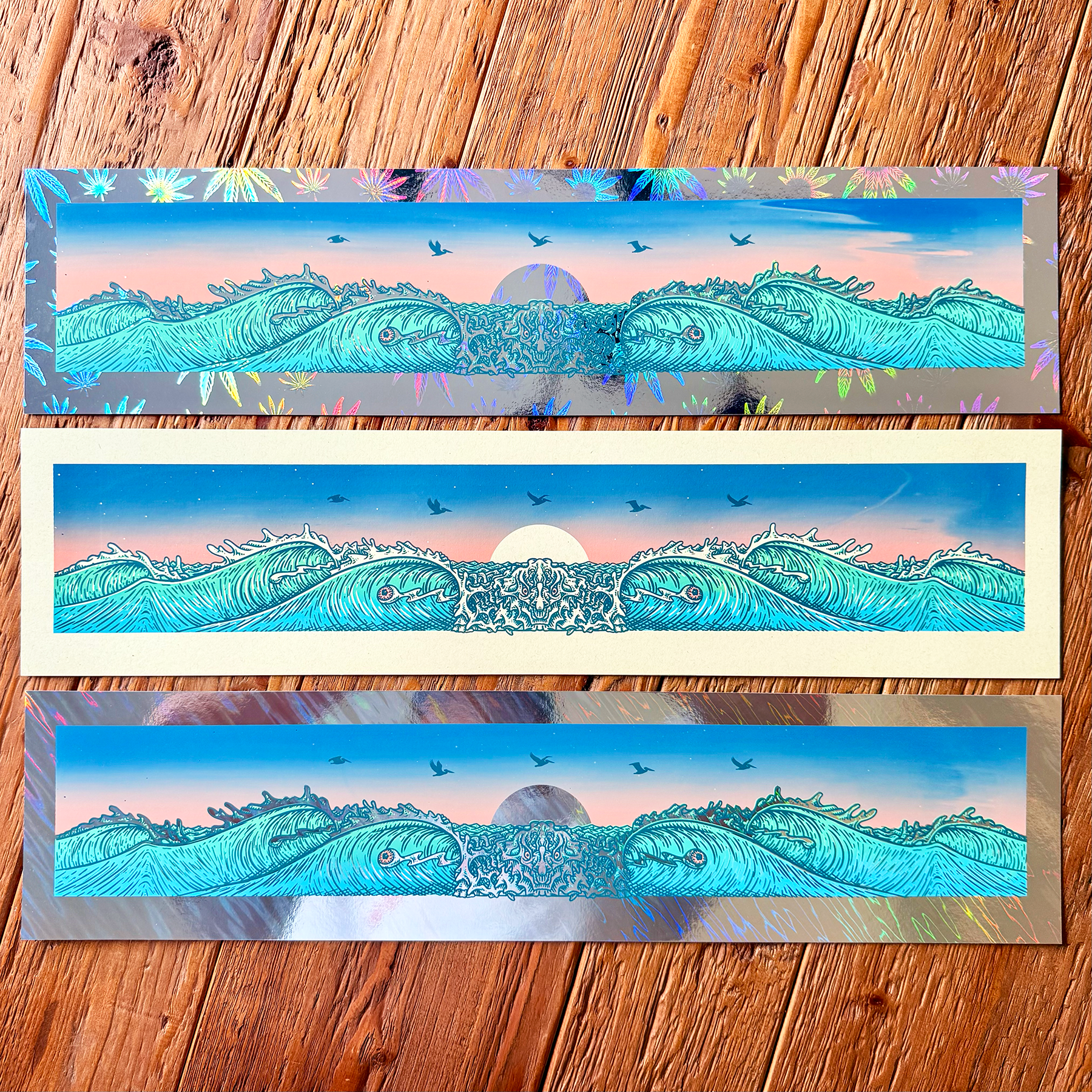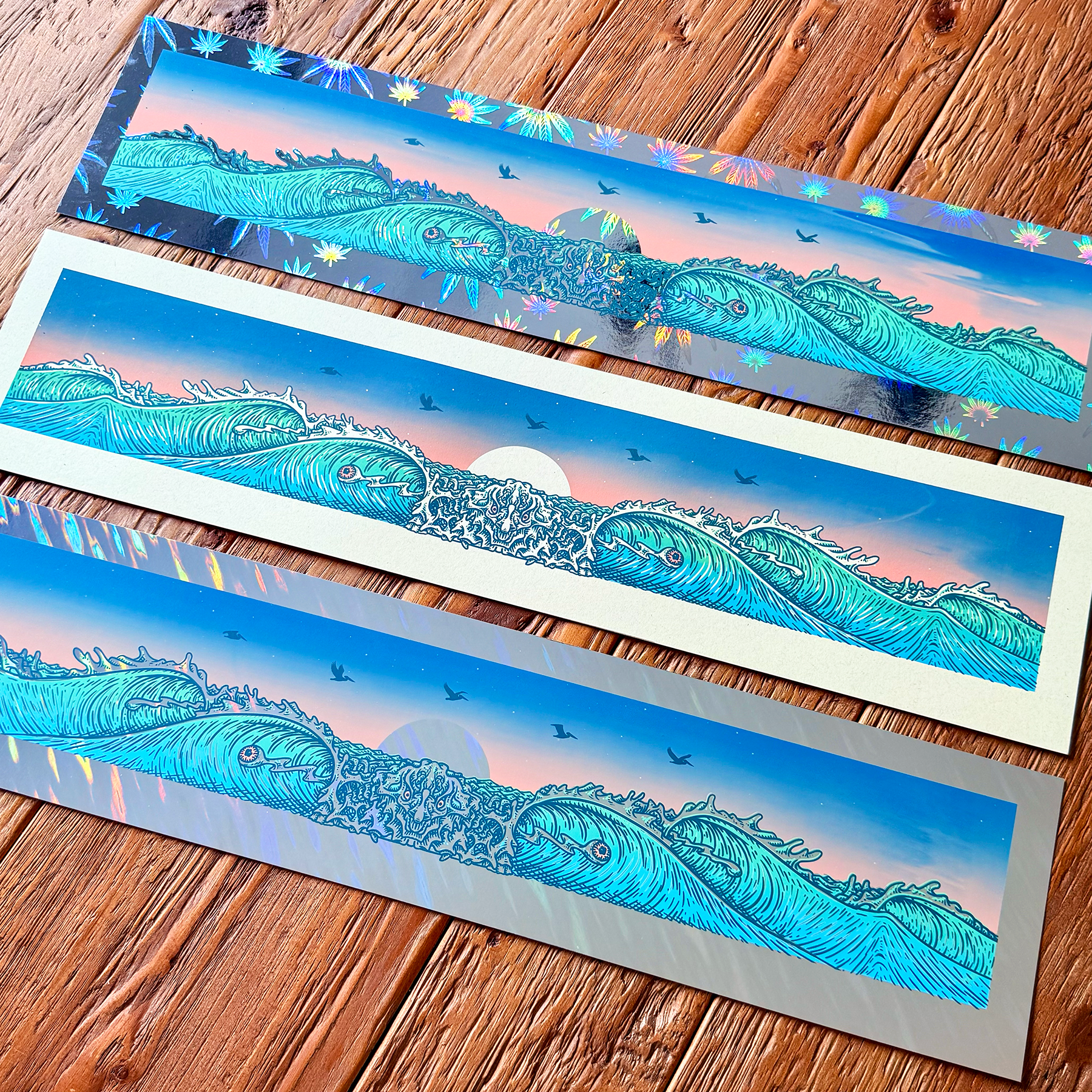 3 color hand-pulled silkscreen with two split fountains; each print has its own unique coloring for the sky and waves