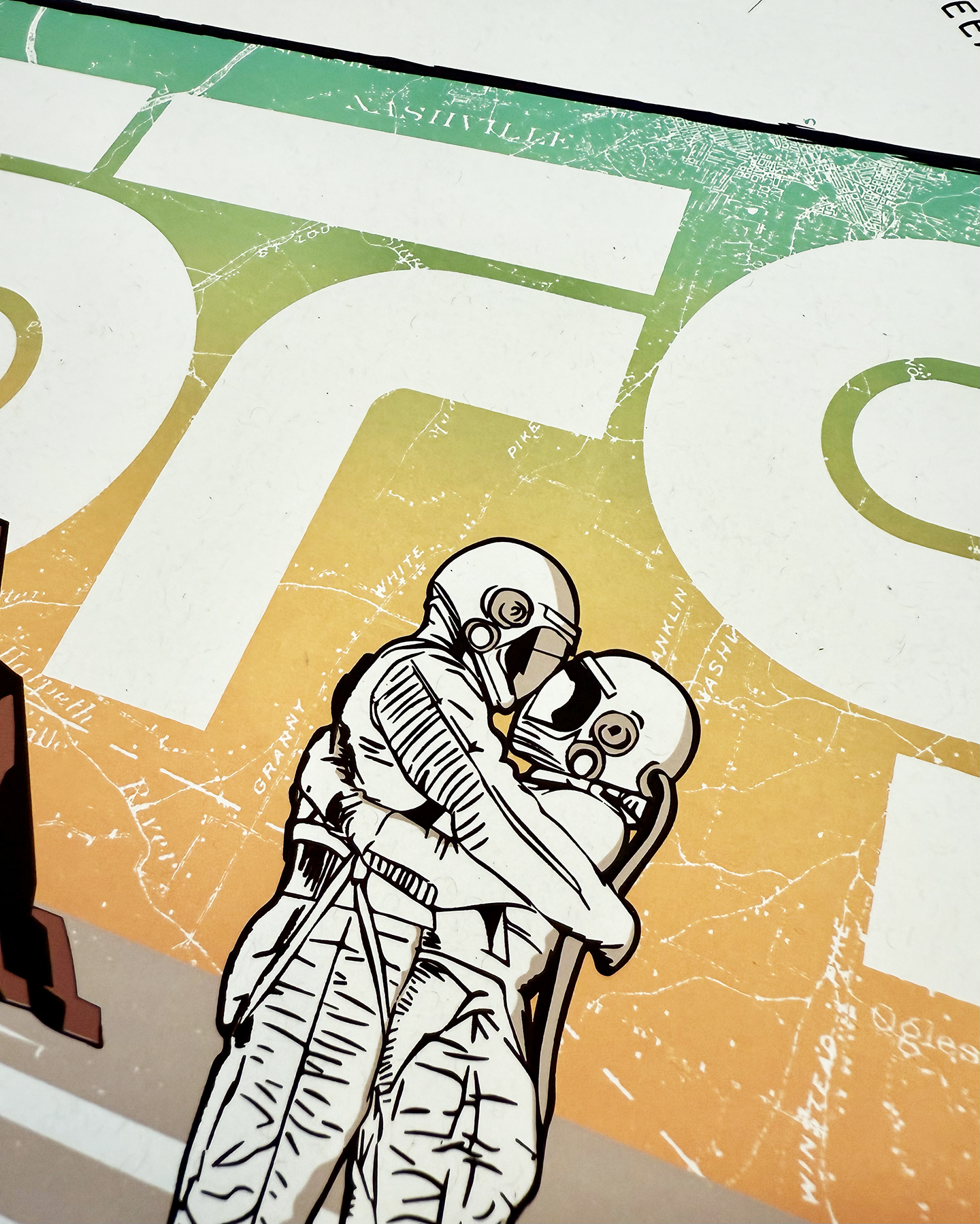 4 color hand-pulled silkscreen with one split fountain. Because of the hand-pulled nature of the split fountain, each print in the run has its own unique sky