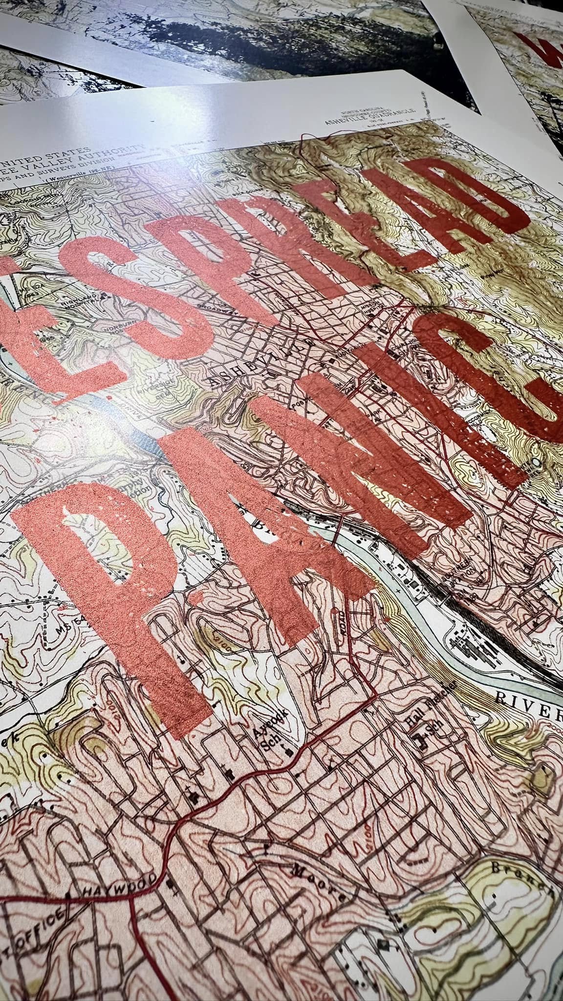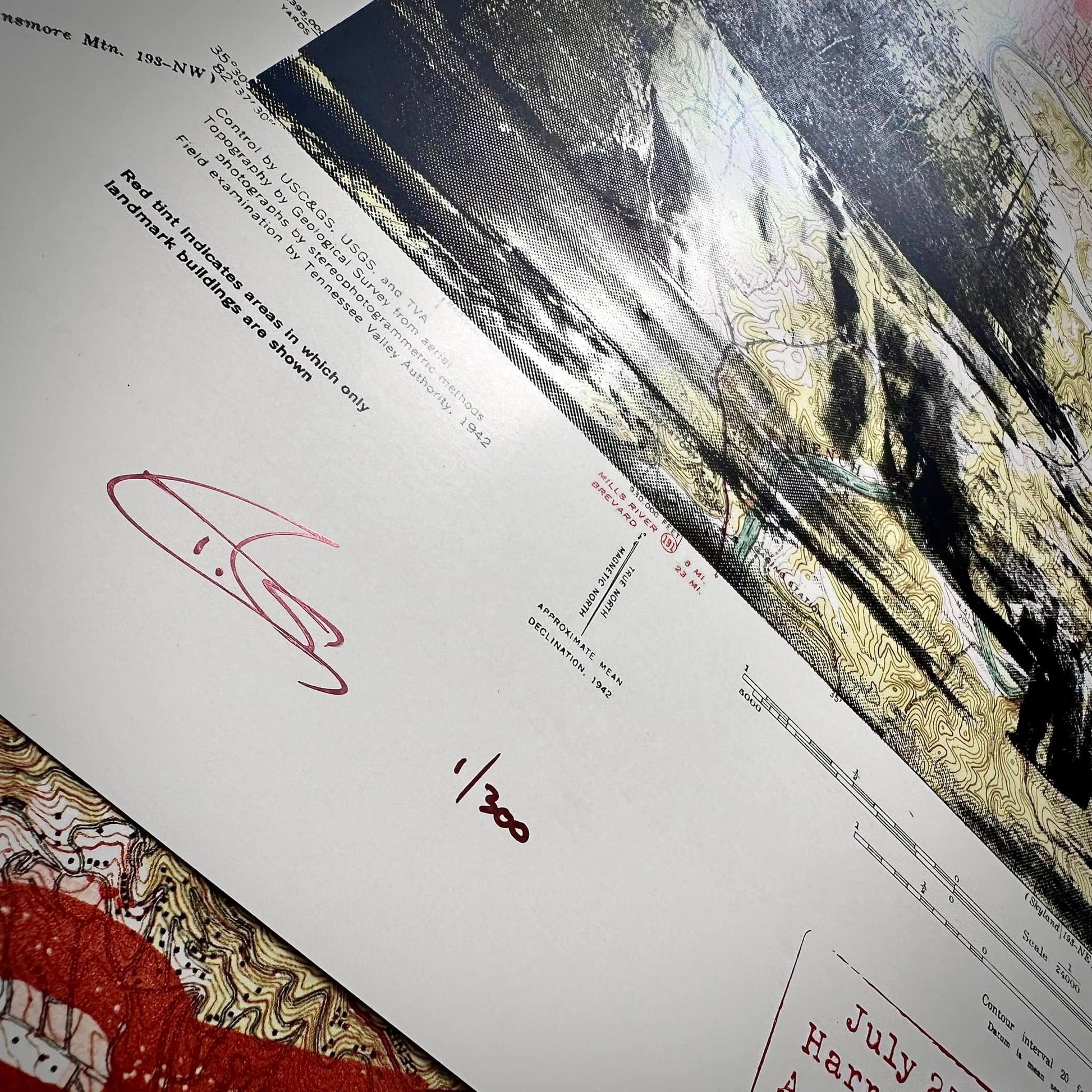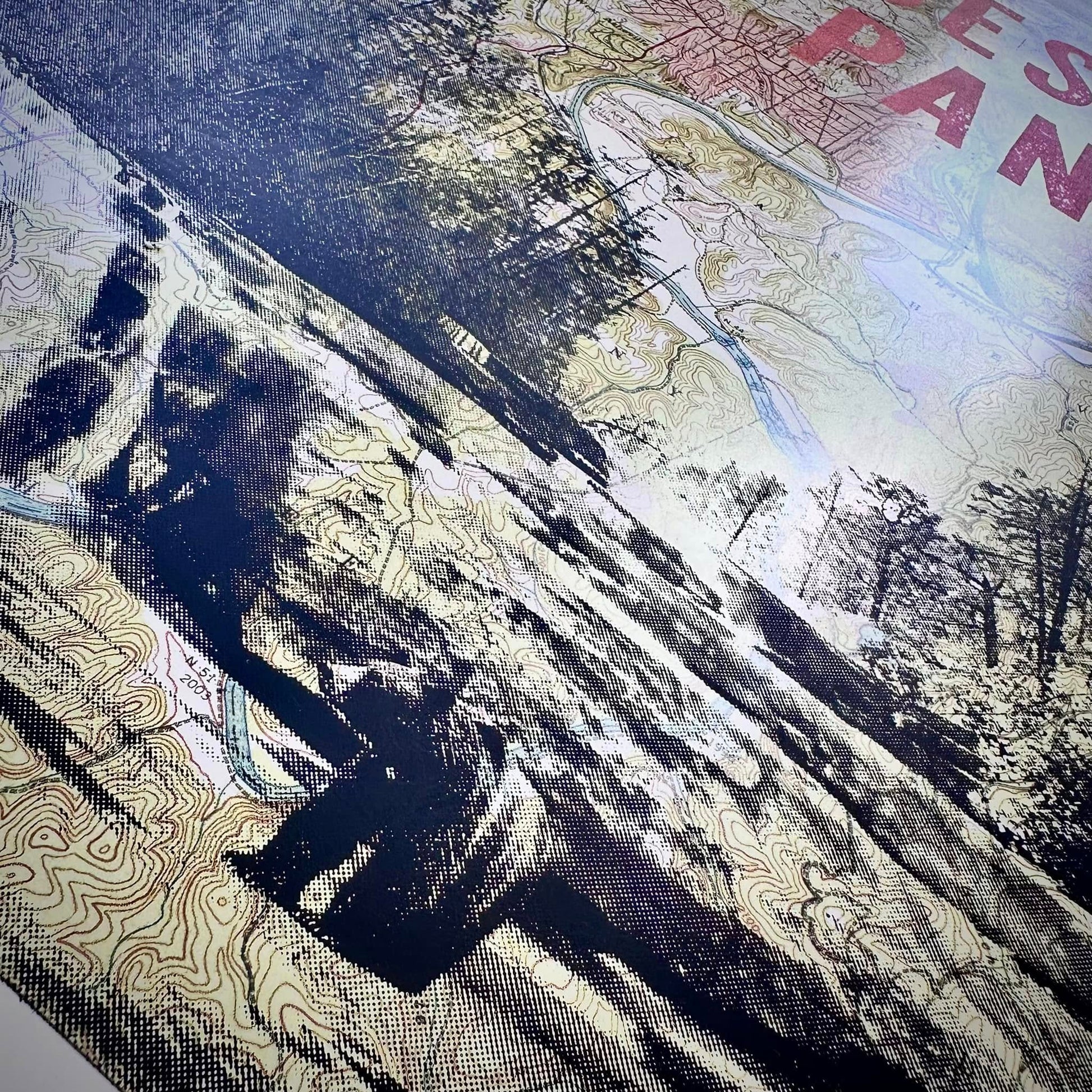 2 color hand-pulled silkscreen on vintage topographic map of the greater Asheville area; the artwork features a "Bear Gone Fishin" at the base of Triple Falls.